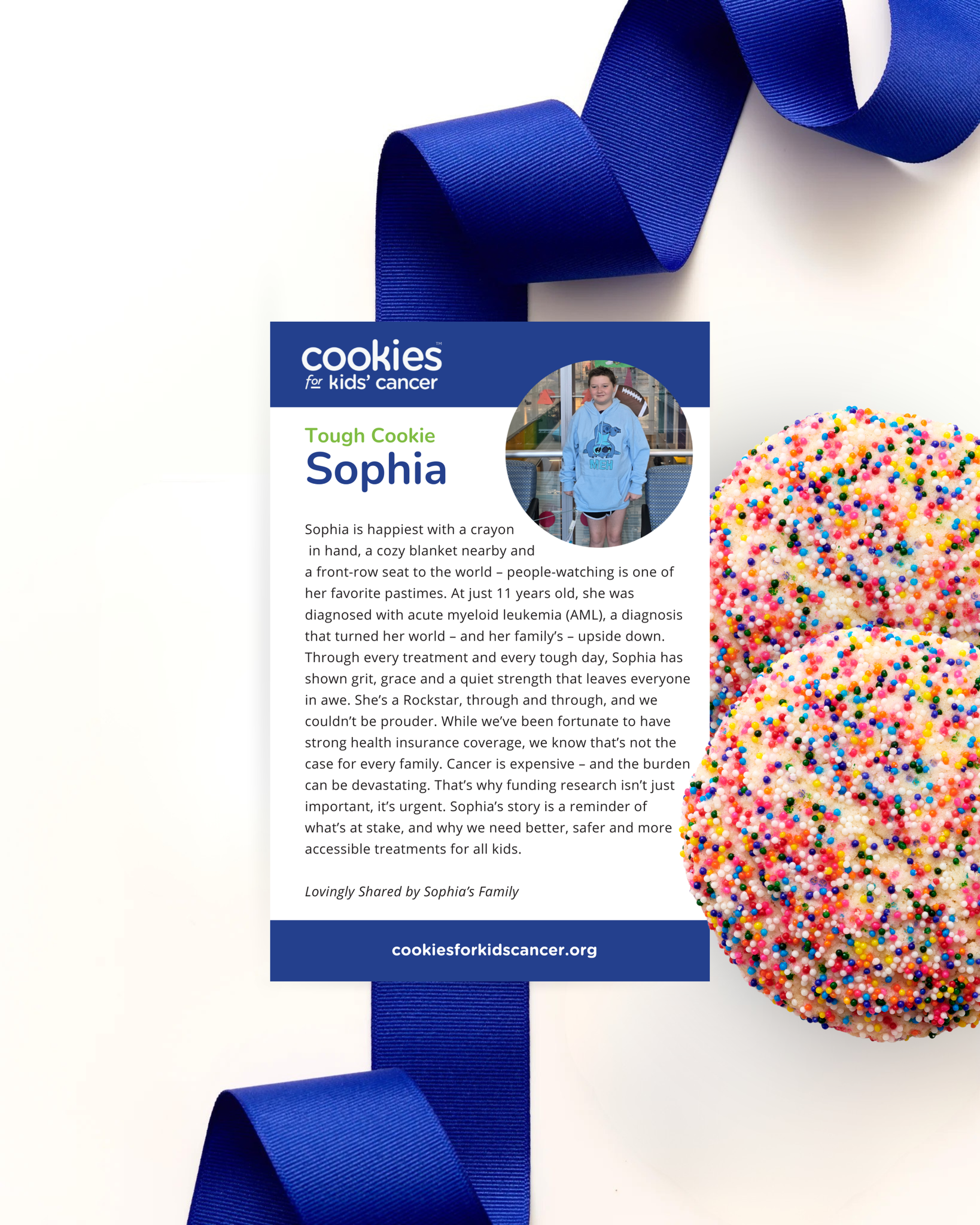 These colorful cookies are inspired by Tough Cookie Sophia, who was diagnosed with acute myeloid leukemia (AML) at just 11 years old. A people-watcher at heart with a cozy blanket always nearby, Sophia faces each day with quiet strength and grace. She’s a rockstar through and through. Each box is wrapped with care and includes a card sharing her story.