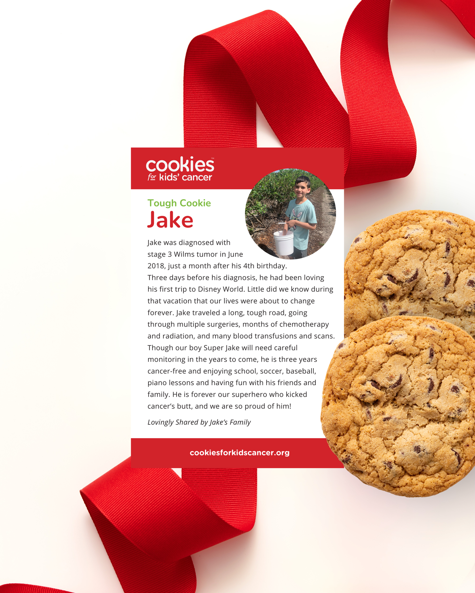 Thick, chewy, and just right—our chocolate chip cookies are soft in the center and slightly crunchy on the edges. This American classic is inspired by Tough Cookie Jake, who was diagnosed with Wilms Tumor at 4 years old. Jake's fight will be honored with these cookies, featuring his favorite color — red — on the bright ribbon and a gift card insert with Jake's story.